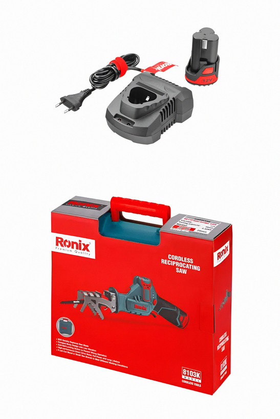 طراحی اره همهکاره یا افقیبر شارژی 8103K رونیکس و ساختار لولهایشکل آن، استفاده از این ابزار را در فضاهای با دسترسی محدود امکانپذیر میکند. این اره به یک موتور 12 ولت DC کوچک اما قدرتمند و با راندمان بالا تجهیز شده است. در این محصول شارژی، از باتری لیتیوم یون 12 ولت با ظرفیت 2 آمپرساعت به عنوان منبع تغذیه استفاده میشود. ابزارگیر این اره افقیبر، اتوماتیک بوده و تعویض سریع و آسان تیغه را برای کاربر امکانپذیر میکند. افزونبراین، در قسمت بالایی این ابزارگیر، میتوان پایهای را برای باغبانی و شاخهزنی نصب کرد.