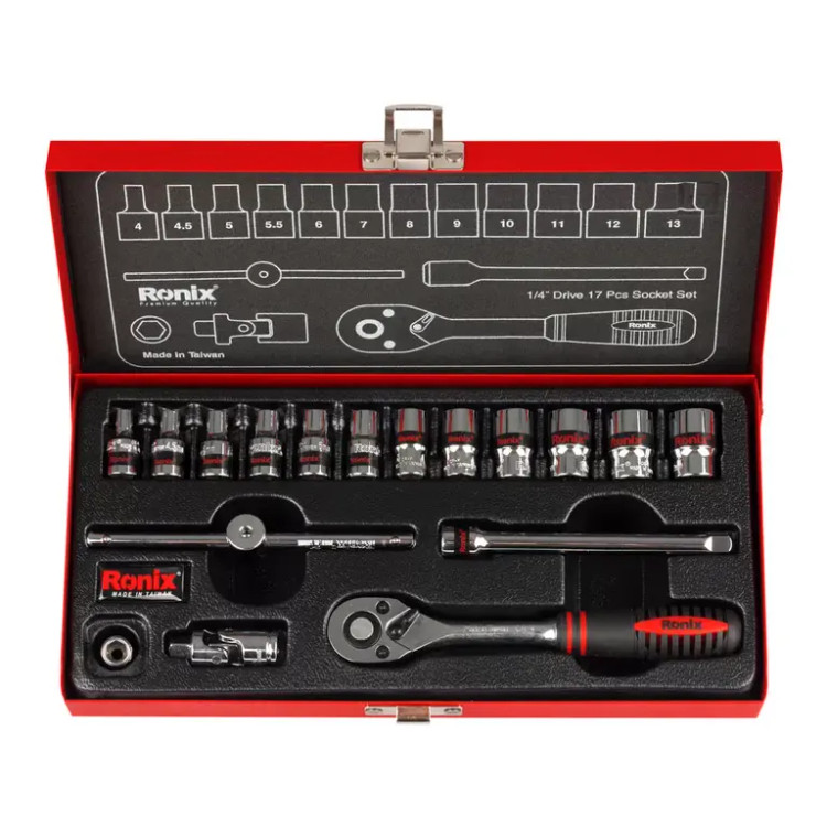 جعبه بکس RH-2617 رونیکس متشکل از 17 قطعه متفاوت شامل آچار، سری و دسته با سایز درایو 1/4 اینچ است.